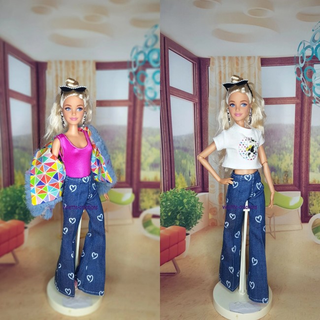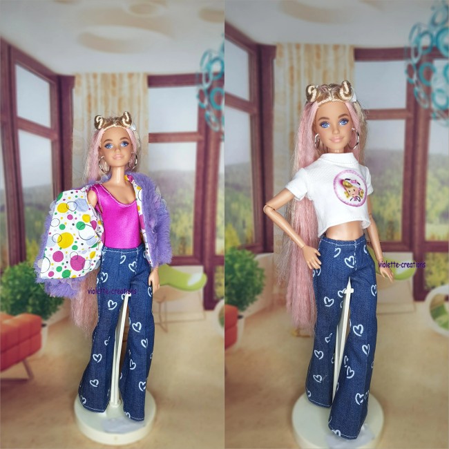 ✨ Tenue casual chic pour poupée mannequin 29 cm – Top lilas à cœurs, jean moderne & collier fleuri