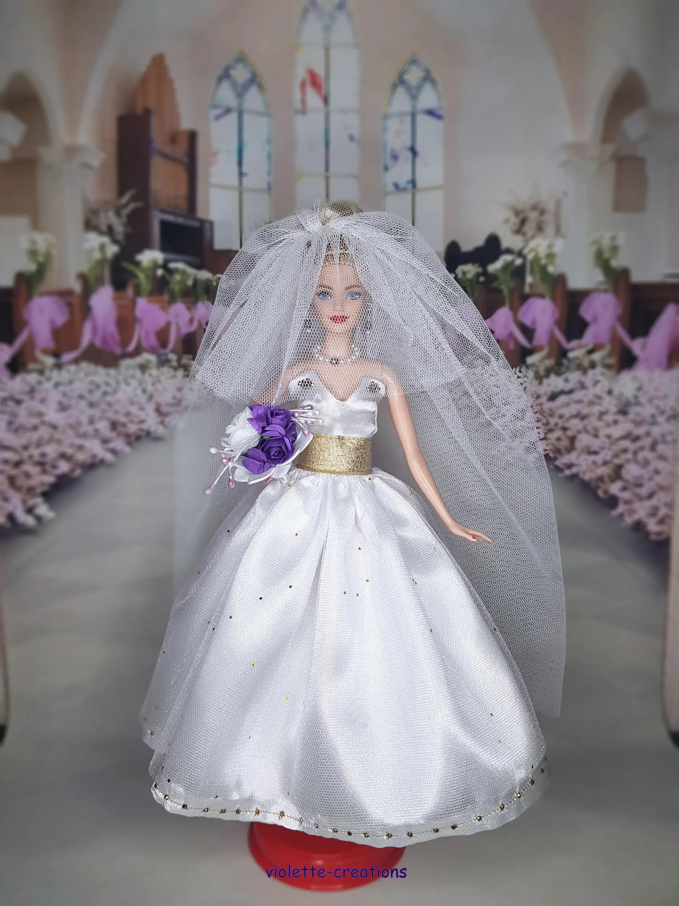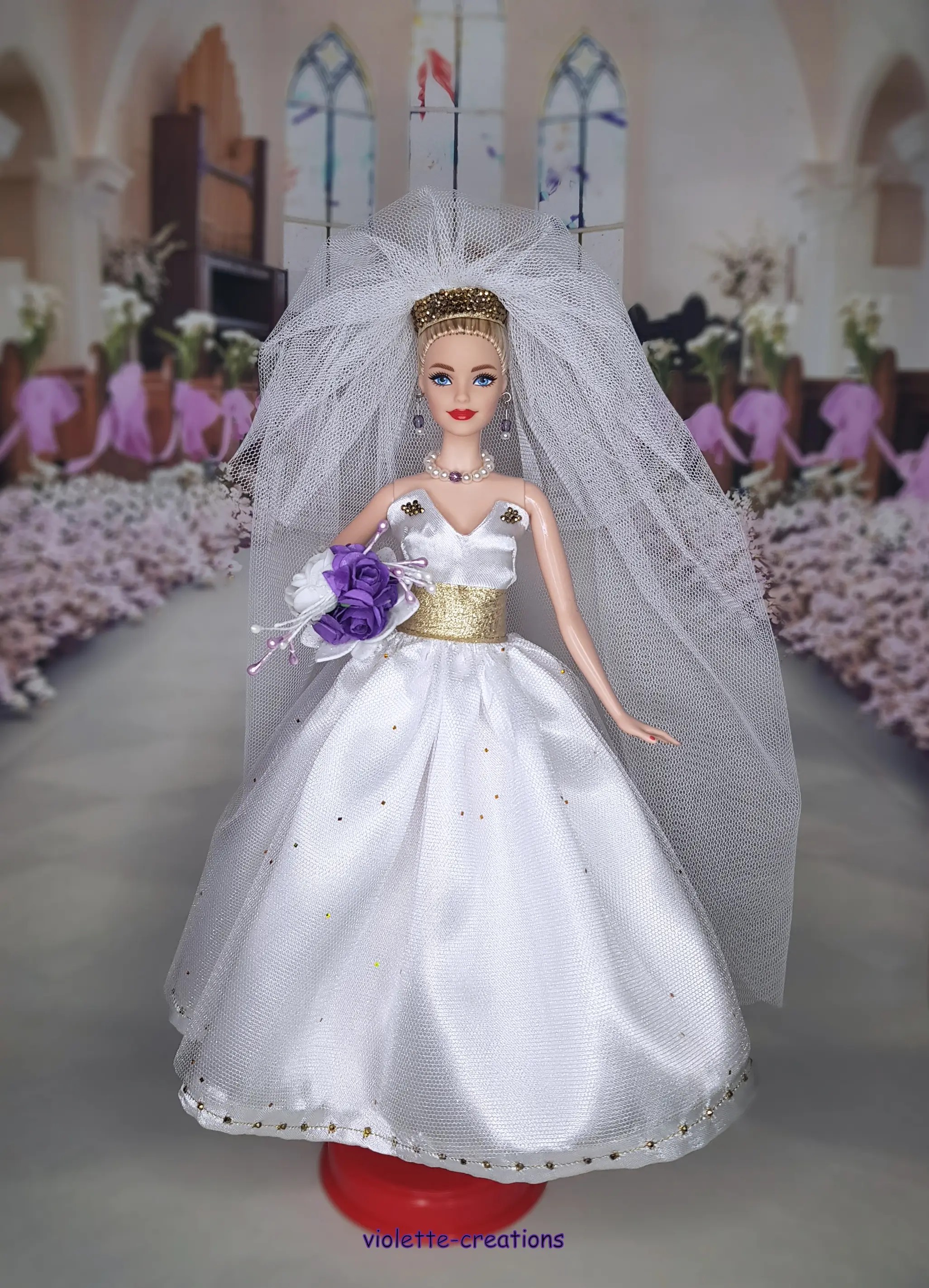 Sublimez vos poupées mannequin 29 cm type Barbie avec cette robe de mariée artisanale élégante et raffinée.Confectionnée en satin blanc de qualité, la jupe est ornée d’un tulle fin pailleté doré qui apporte éclat et légèreté. Une large ceinture dorée vient marquer la taille et mettre en valeur la silhouette.