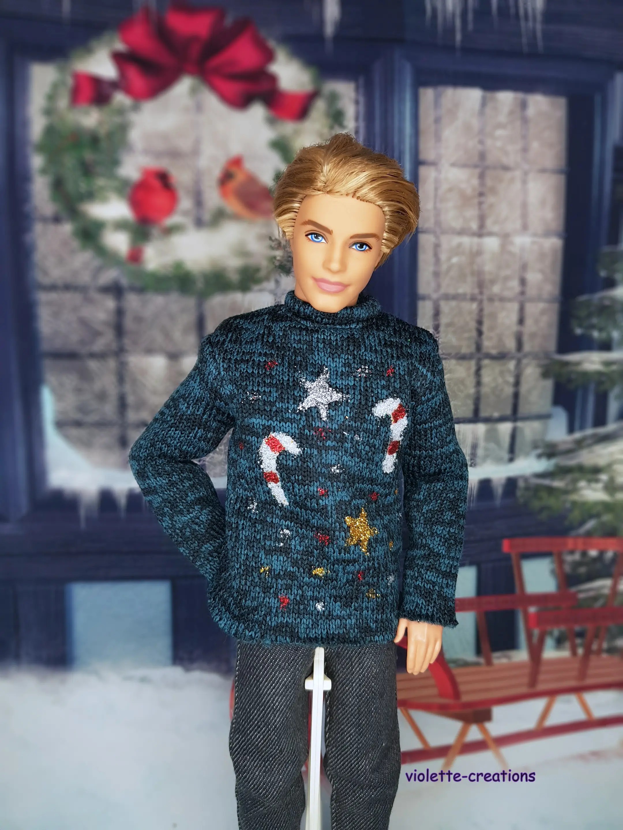 đ Pull de Noël bleu en coton pour poupée Ken – Style festif & confort d’hiver