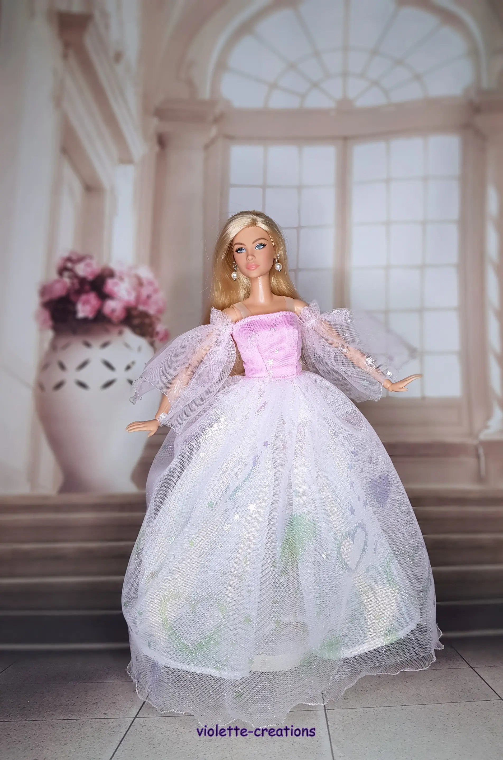 La jupe en tulle scintillant ornée d’étoiles et de cœurs donne un effet féerique, tandis que le corsage ajusté met en valeur la silhouette élégante de la poupée.