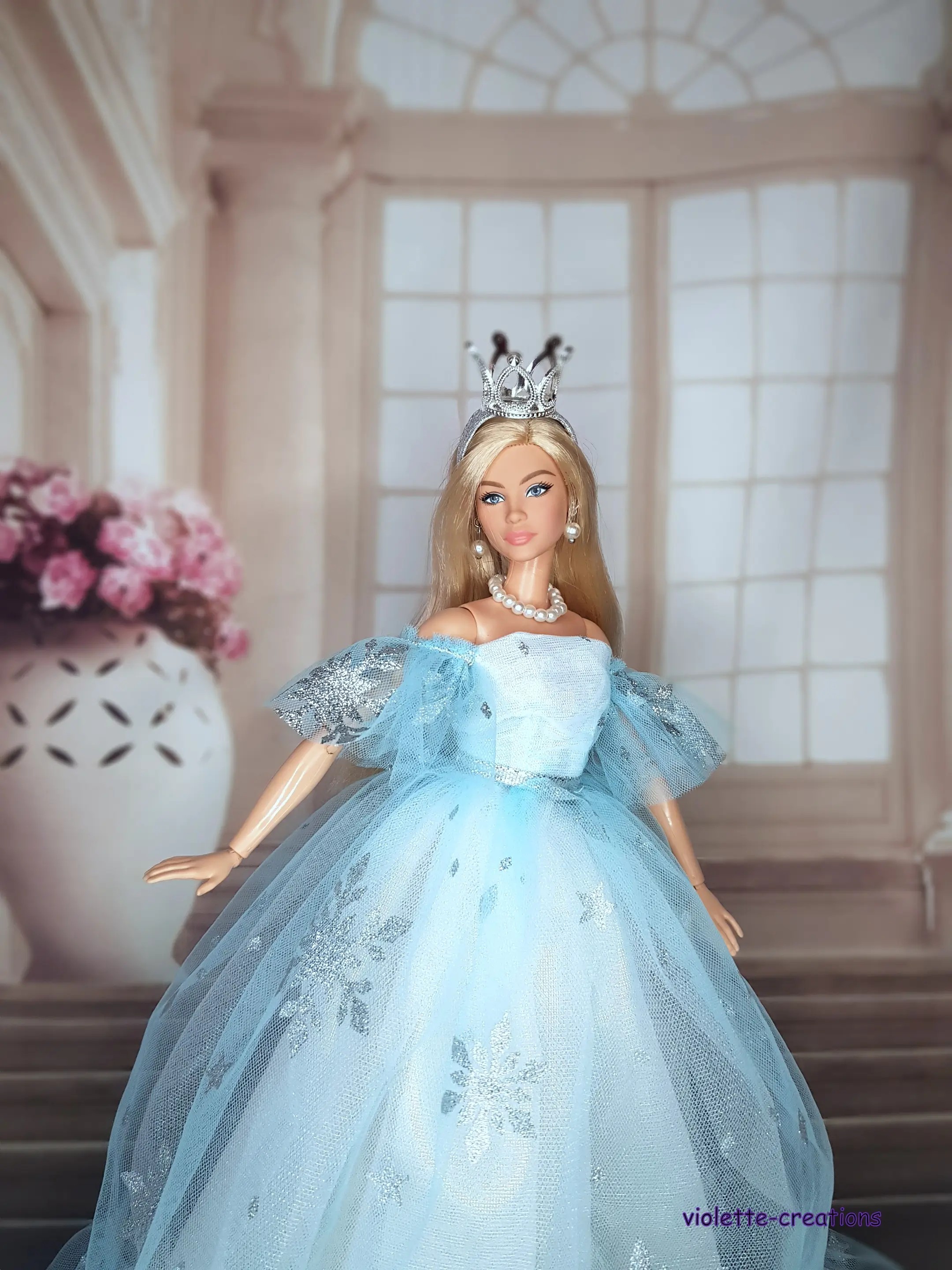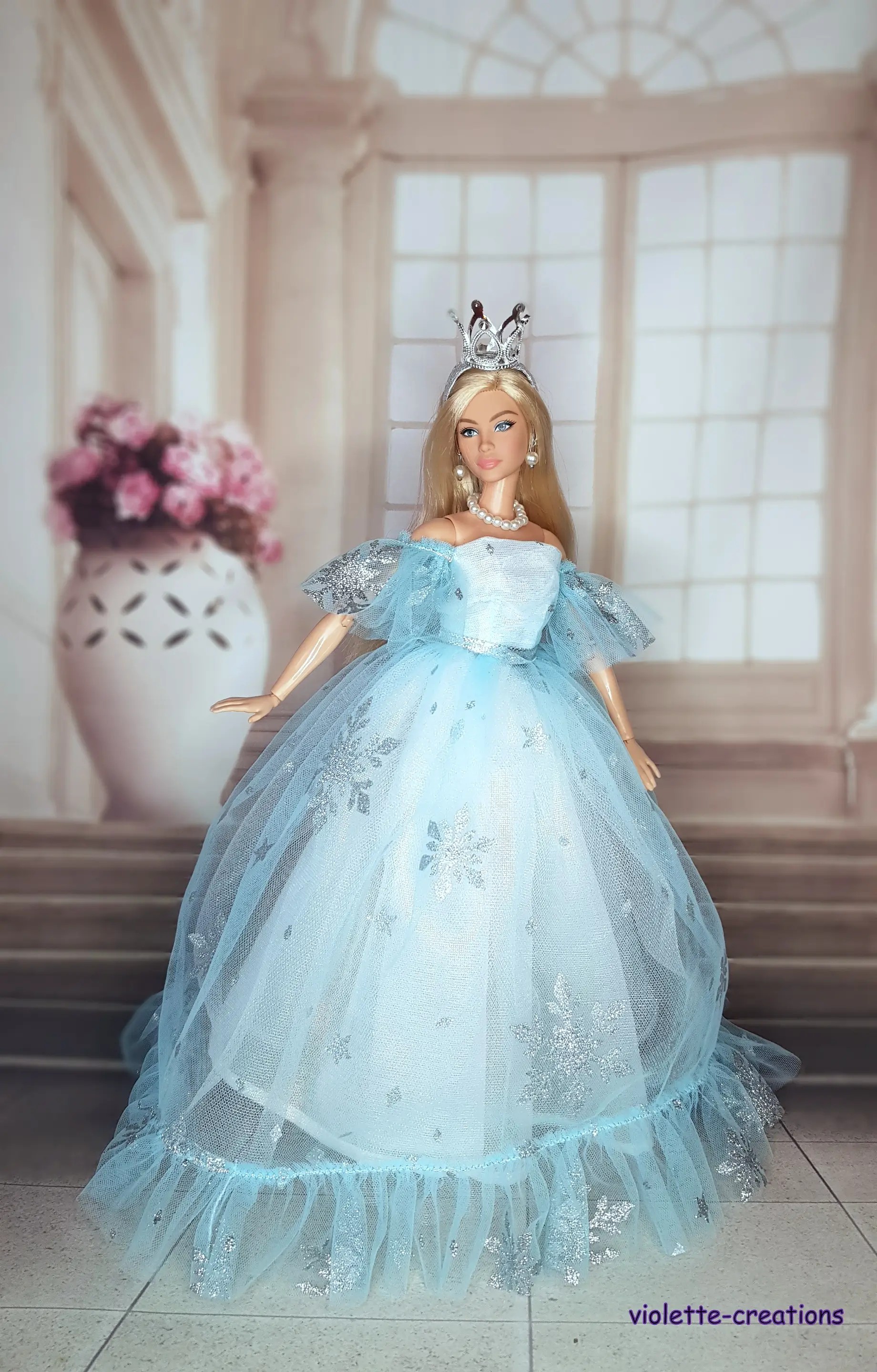 Offrez à votre poupée mannequin un look royal avec cette somptueuse robe de princesse bleu clair, sublimée de flocons de neige argentés. Une création élégante et magique, idéale pour les fêtes, les photos ou pour enrichir une collection.