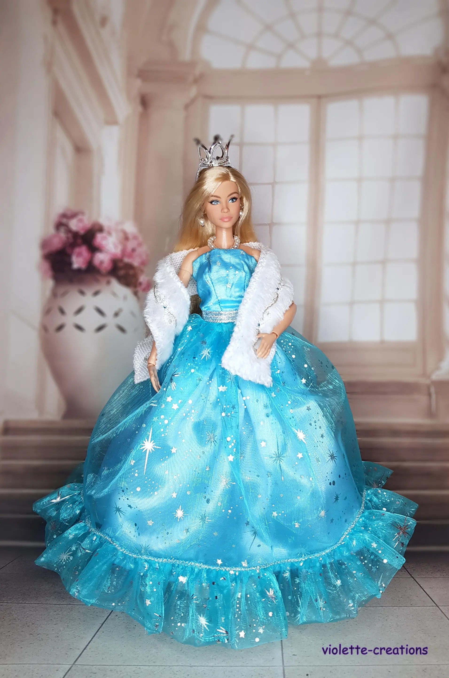 Transformez votre poupée en véritable princesse avec cette superbe robe bleu clair scintillante, décorée de petites étoiles argentées qui captent la lumière à chaque mouvement. Une création raffinée et féerique, parfaite pour les photos, les scènes de collection ou les cadeaux.