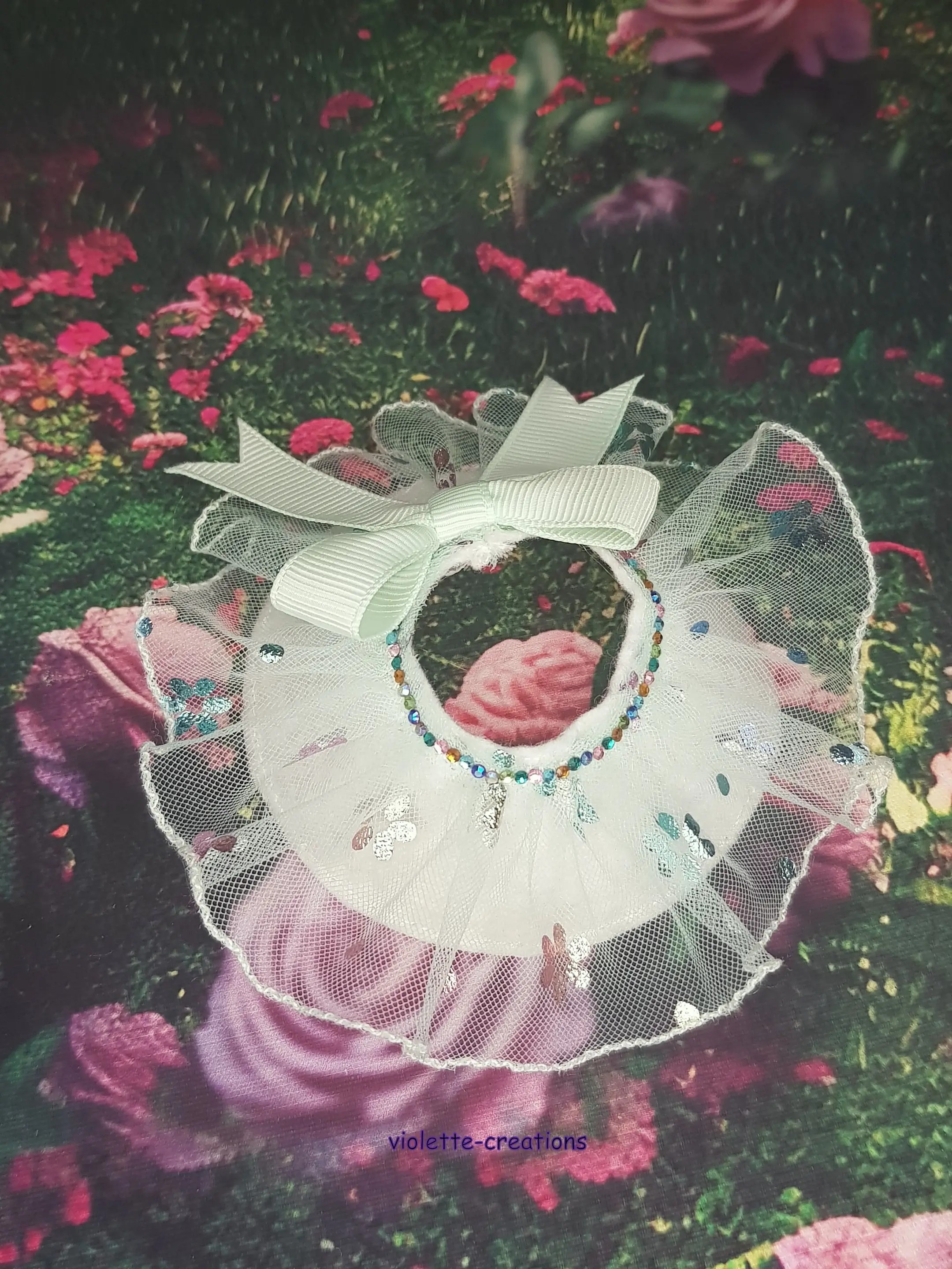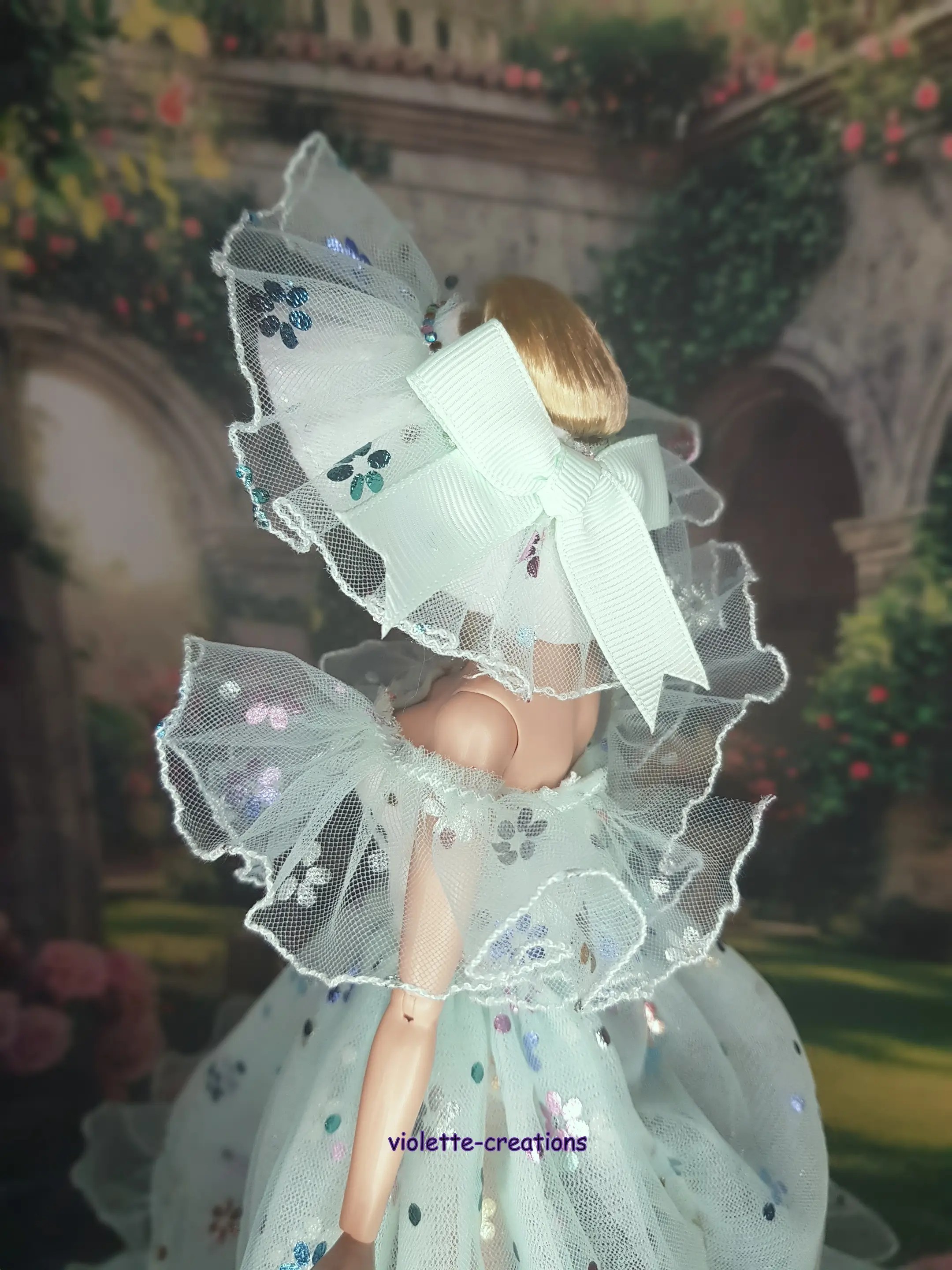 Cette tenue est accompagnée d’un chapeau assorti en tulle vert d'eau, finement décoré de petites fleurs, qui vient compléter le look avec poésie. La poupée tient également un petit sac cœur coordonné, ajoutant une note délicate et originale à cette création.