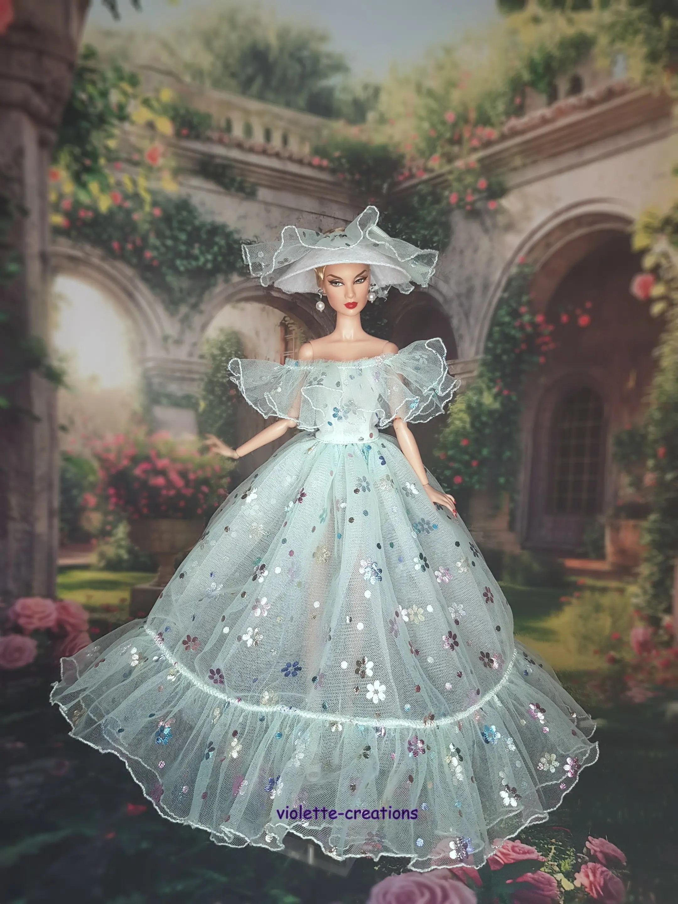 ✨ Robe Princesse vert d'eau Fleurie – Poupée type Barbie ✨