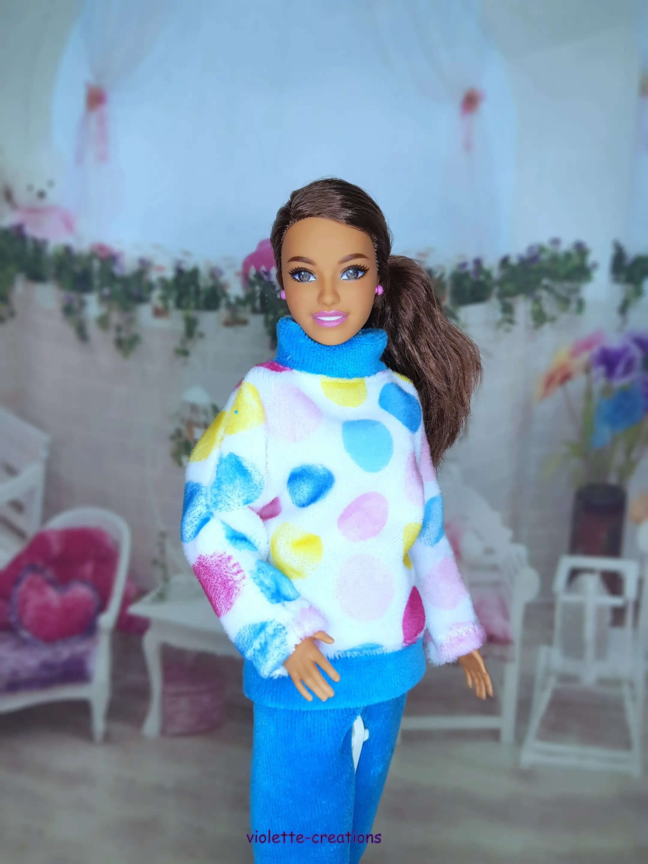 Craque pour cette tenue cocooning ultra douce pour poupée type Barbie, idéale pour les moments détente et les soirées au chaud. L’ensemble se compose d’un haut à manches longues, au toucher moelleux, décoré de jolis pois multicolores, et d’un pantalon bleu assorti confortable et élégant.