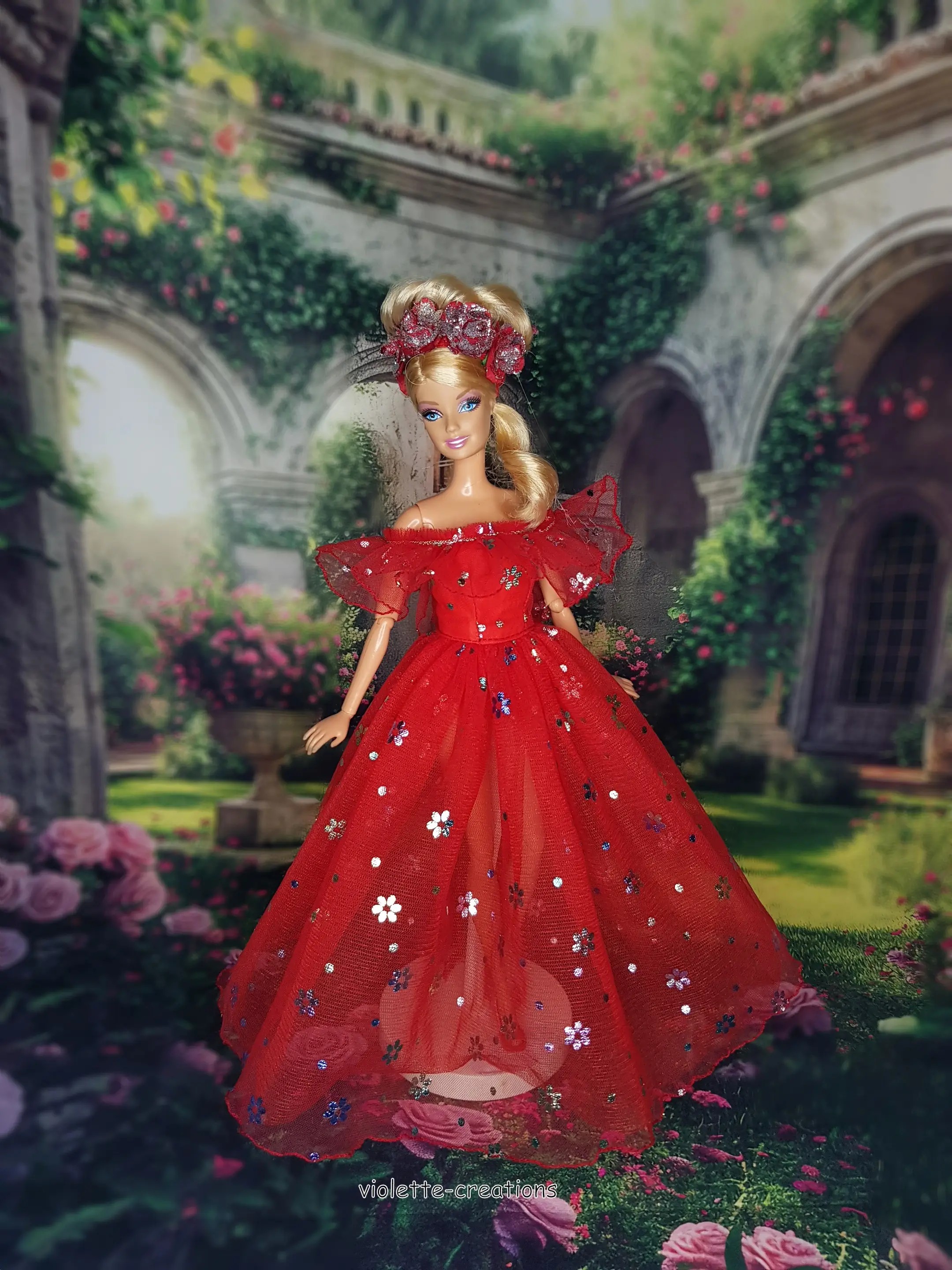 Faites briller votre poupée type Barbie avec cette magnifique robe de princesse rouge accompagnée de son serre-tête orné de roses rouge et argenté 🌹✨