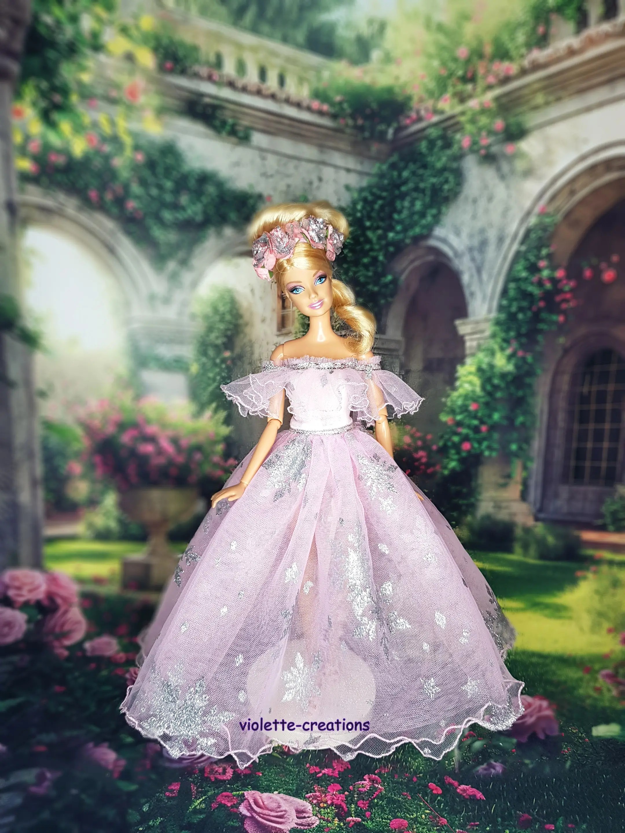 Plongez dans un univers doux et enchanteur avec cette sublime robe de princesse rose pour poupée type Barbie, accompagnée de son serre-tête orné de fleurs rose et argenté 🌸✨