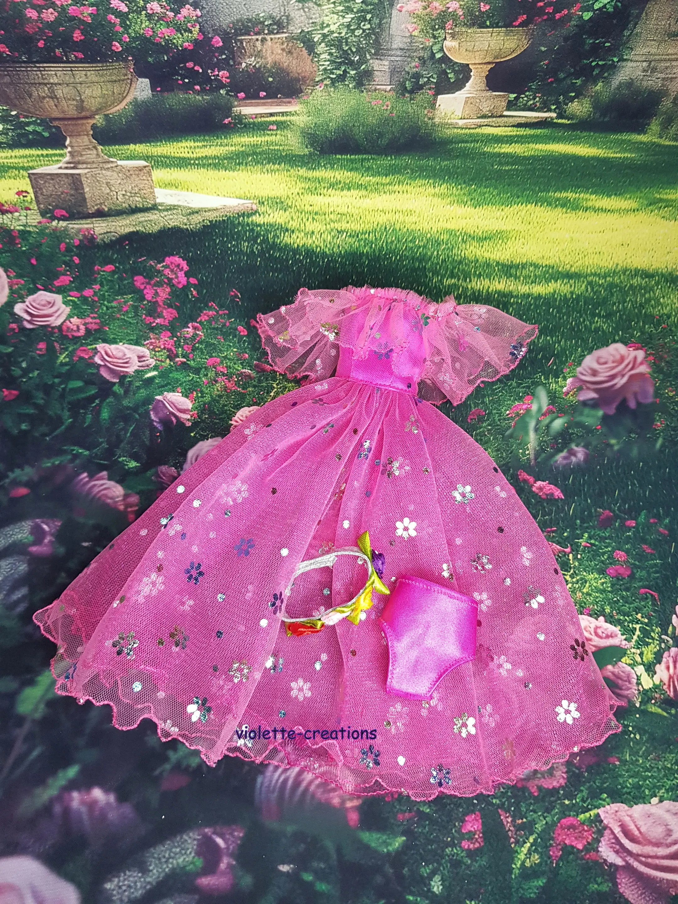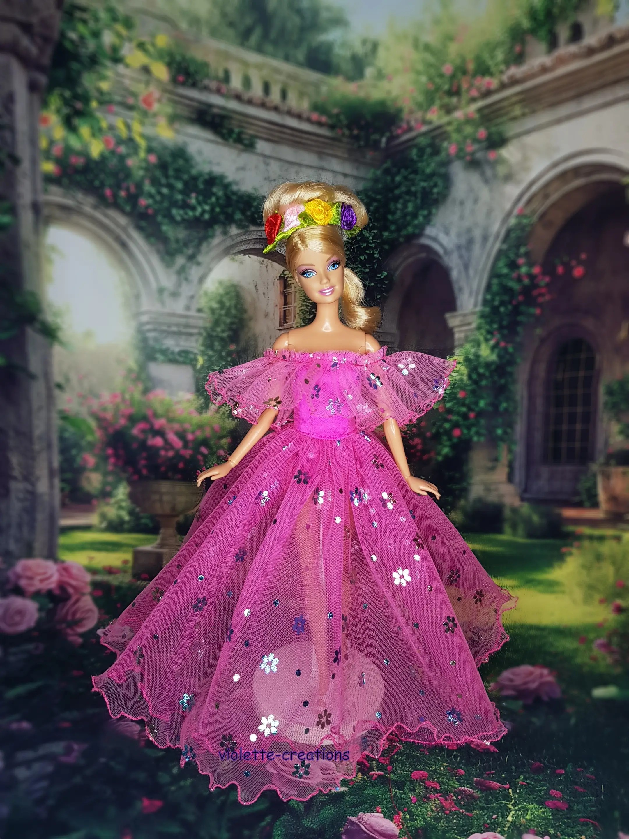 Apportez une touche de magie et de couleur avec cette superbe robe de princesse fuchsia pour poupée type Barbie, accompagnée de son serre-tête orné de fleurs multicolores 🌈🌸