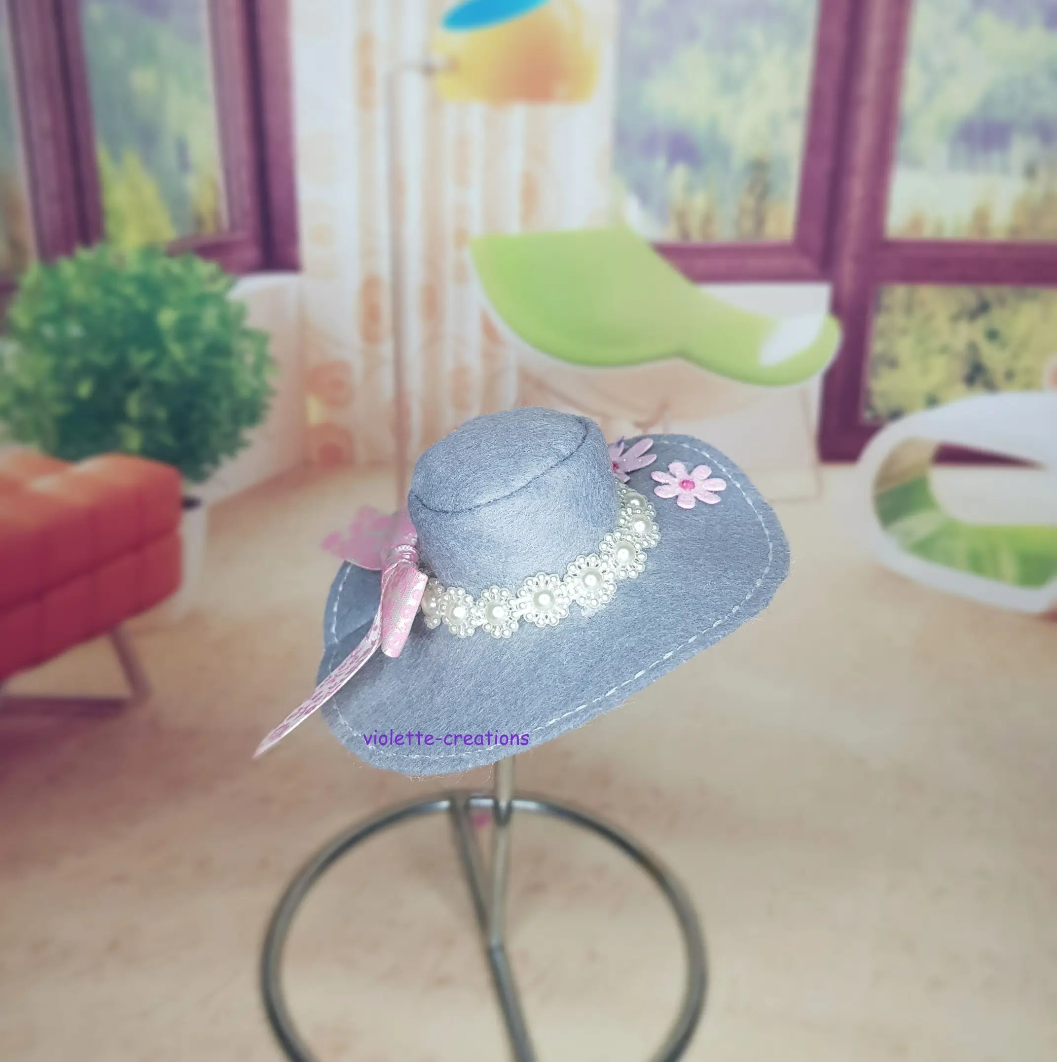 👒 Chapeau en feutrine gris romantique – Poupée type Barbie