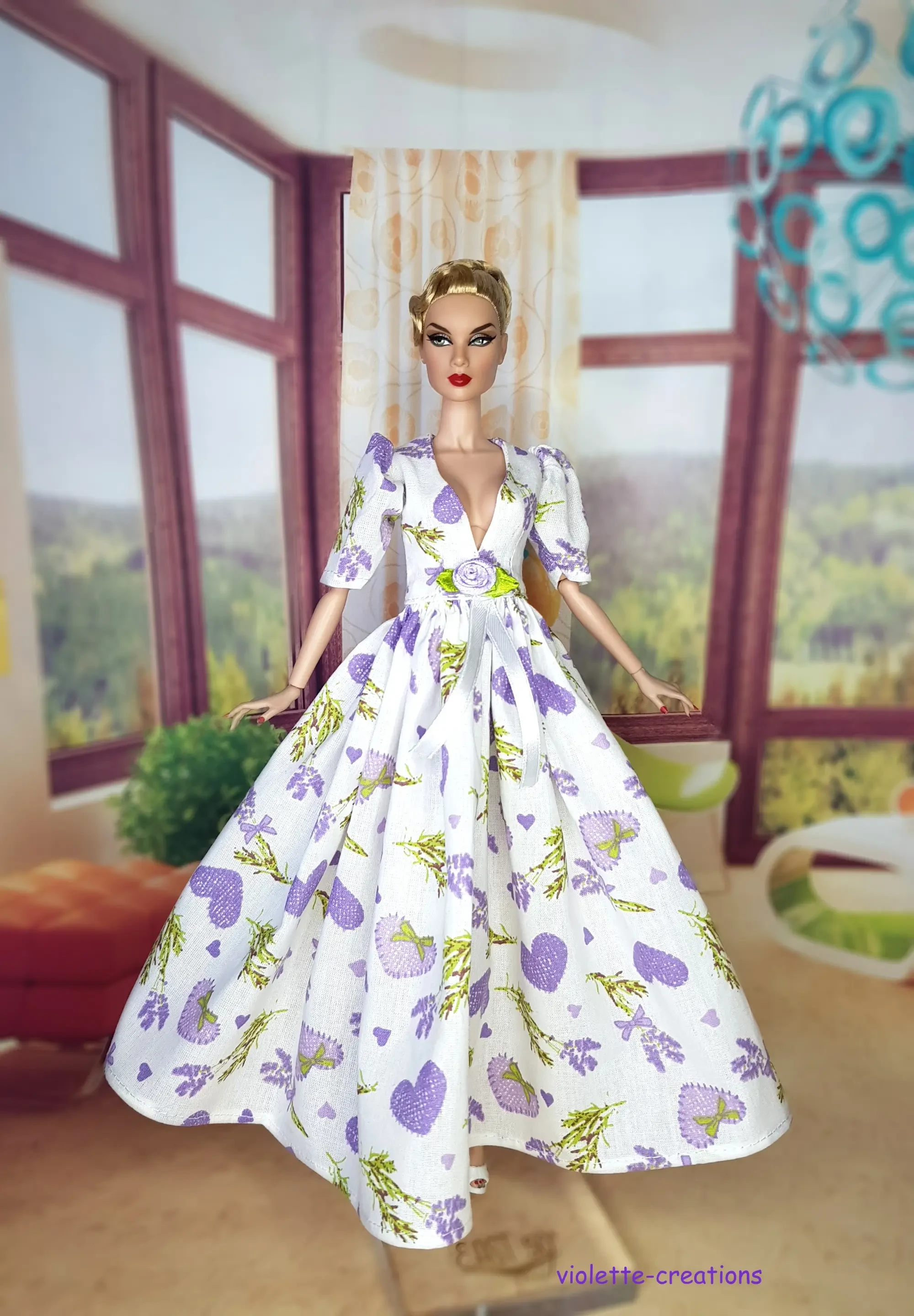 Craquez pour cette élégante robe pour poupée type Barbie, confectionnée en coton provençal aux délicats motifs lavande đ